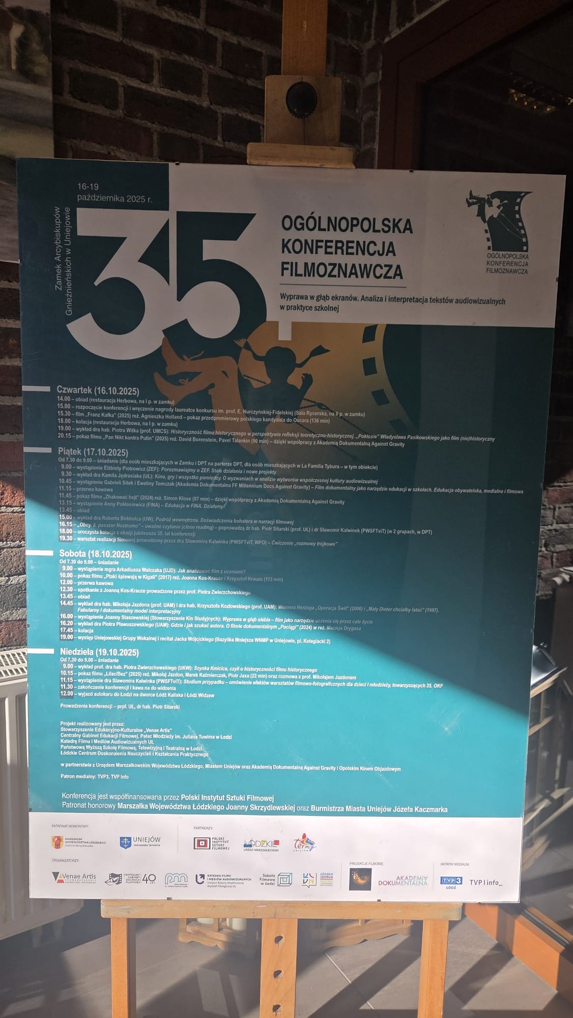 Filmowa wyprawa w głąb ekranów - 35. Ogólnopolska Konferencja Filmoznawcza. W dniach 16-19 października 2025 r. nasi nauczyciele, p. Anna Adamus i p. Łukasz Handzel, wzięli udział w 35. Ogólnopolskiej Konferencji Filmoznawczej w Uniejowie. Tegoroczna edycja konferencji nosiła tytuł: „Wyprawa w głąb ekranów. Analiza i interpretacja tekstów audiowizualnych w praktyce szkolnej". Przez cztery intensywne dni uczestnicy mieli okazję: brać udział w wykładach, dyskusjach i warsztatach poświęconych edukacji filmowej, poznawać nowe metody interpretacji dzieł audiowizualnych, uczestniczyć w warsztacie realizacji filmowej "rozmowy trójkowe", wymieniać doświadczenia z nauczycielami i filmoznawcami z całej Polski, wziąć udział w spotkaniu autorskim z reżyserką Joanną Kos-Krauze, uczestniczyć również w wydarzeniach towarzyszących – m.in. w koncercie Uniejowskiej Grupy Wokalnej i recitalu Jacka Wójcickiego mających miejsce w Bazylice Mniejszej w Uniejowie. Nasi nauczyciele wrócili nie tylko z nową wiedzą i głowami pełnymi pomysłów, ale również z konferencyjnymi "odznaczeniami", które symbolicznie podkreślają ich zaangażowanie w rozwój edukacji filmowej.