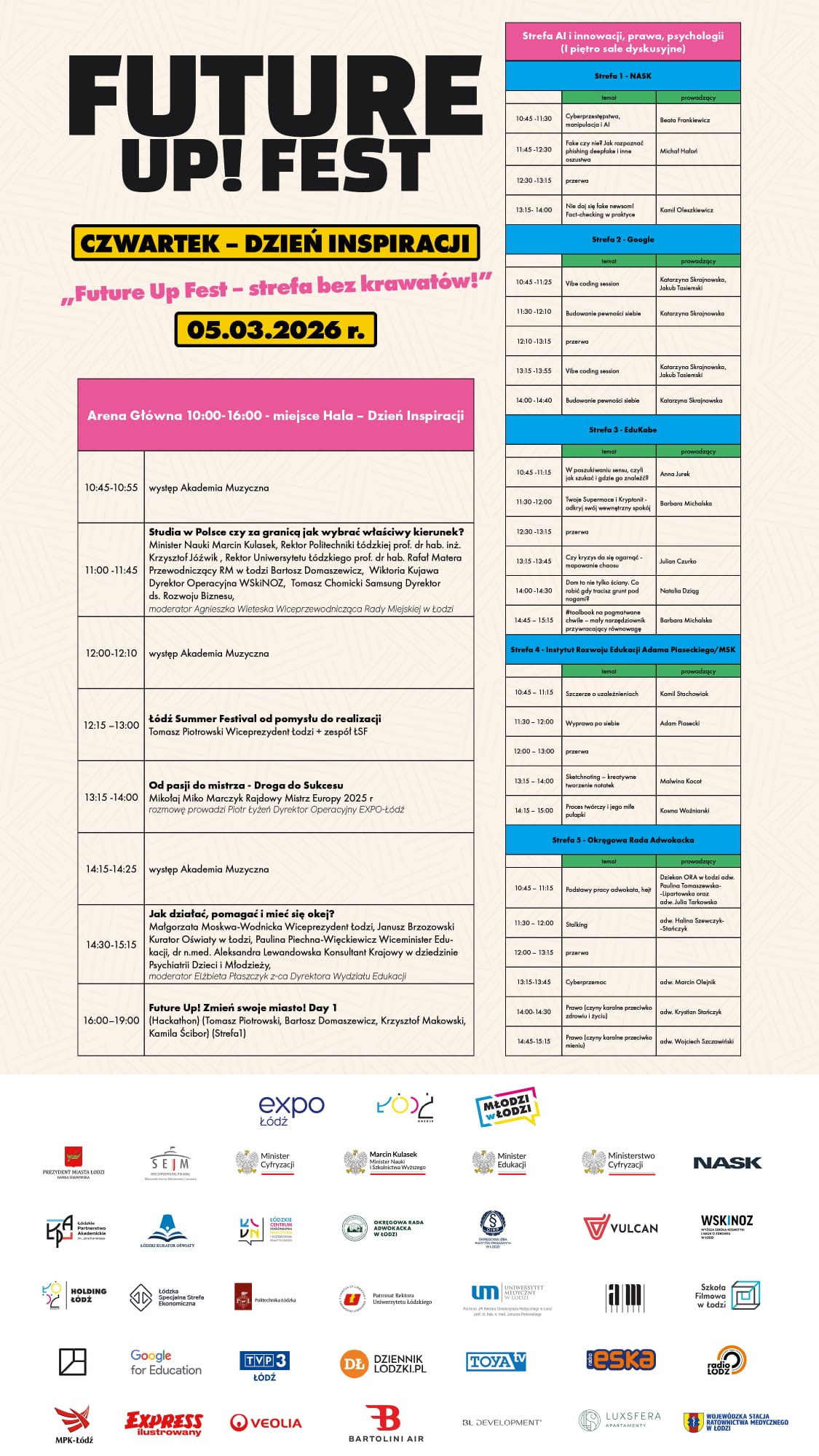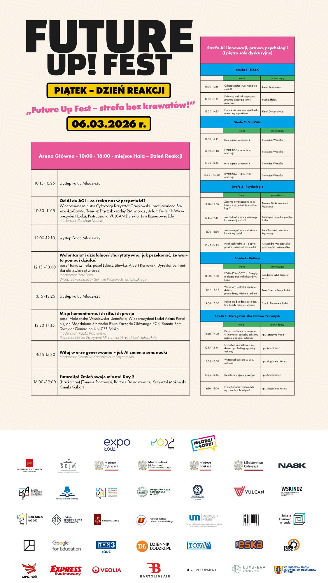 W trakcie Future Up! Fest odwiedzą nas i wezmą udział w panelach dyskusyjnych przedstawiciele Rządu, Sejmu RP oraz organizacji pozarządowych m.in. Wicepremier Minister Cyfryzacji Krzysztof Gawkowski, Minister Nauki Marcin Kulasek, Wiceminister Edukacji Paulina Piechna-Więckiewicz, posłowie: Aleksandra Wiśniewska-Uznańska, Tomasz Trela, Łukasz Litewka, Rektor Politechniki Łódzkiej prof. Krzysztof Jóźwik, Łódzki Kurator Oświaty Janusz Brzozowski, dr. Aleksandra Lewandowska Konsultant Krajowy w dziedzinie Psychiatrii Dzieci i Młodzieży, przedstawiciele PCK, UNICEF.