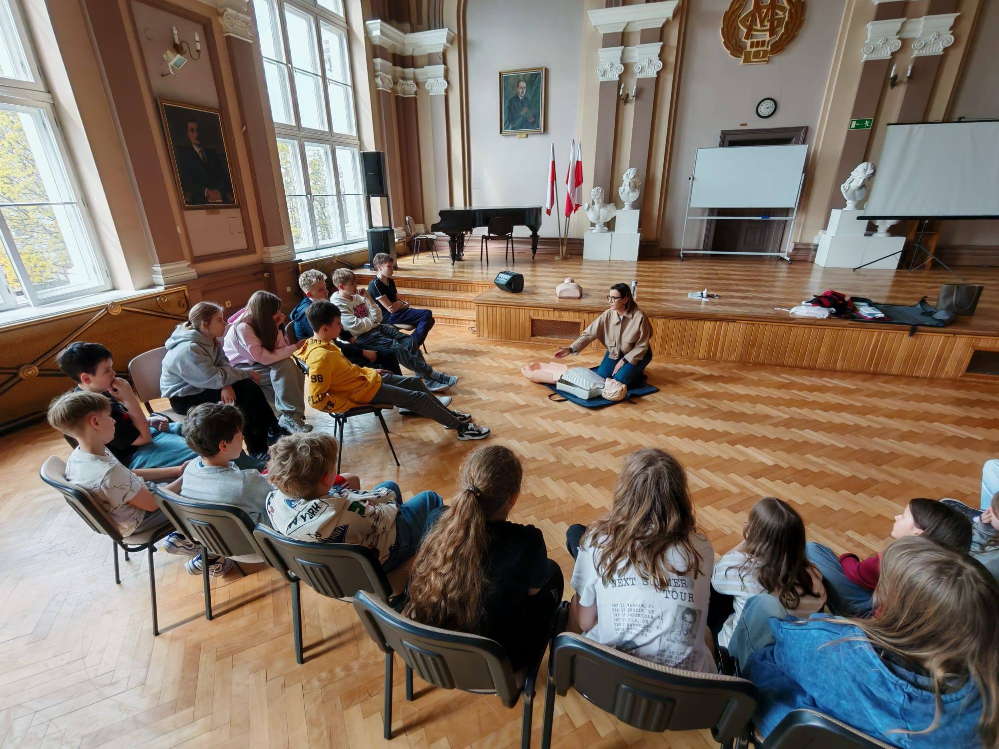 Uczniowie klasy 5a oraz część uczniów klasy 7a wzięło udział w szkoleniu z zakresu pierwszej pomocy przedmedycznej. Podczas zajęć młodzież zdobyła praktyczne umiejętności, które mogą uratować czyjeś życie - od oceny sytuacji i wezwania pomocy, po prowadzenie resuscytacji. Szczególną uwagę poświęcono obsłudze AED oraz kamizelce do nauki zadławień.