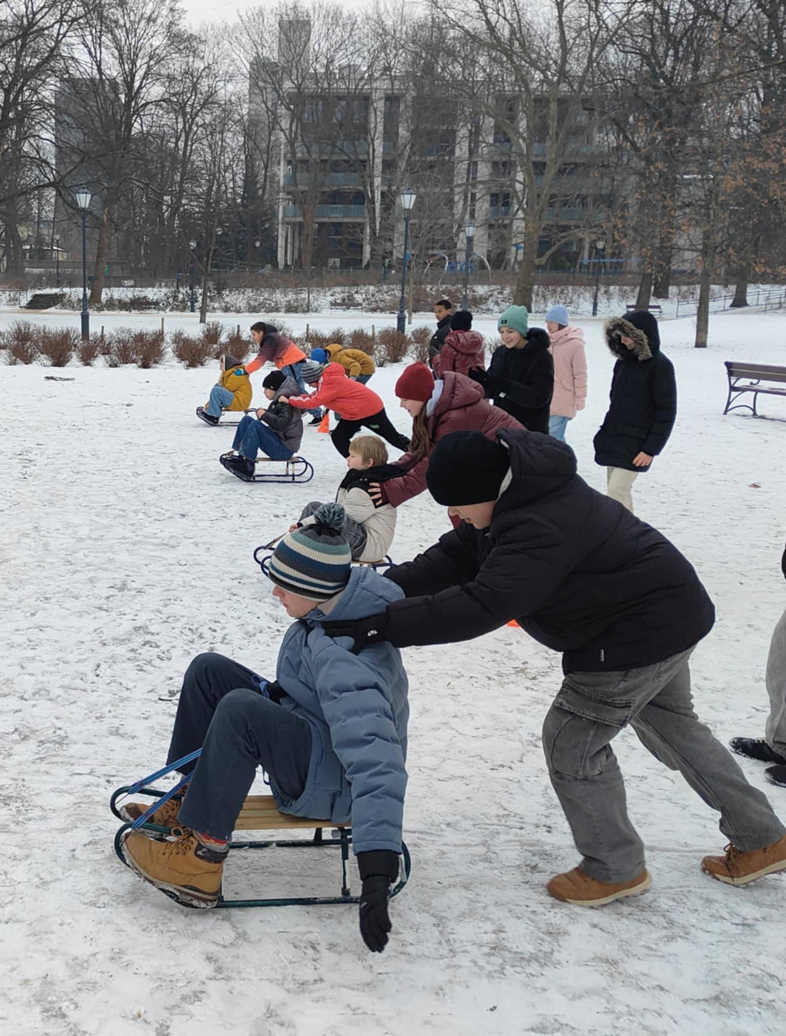 Przed feriami zimowymi odbyły się zajęcia wychowania fizycznego w parku z wykorzystaniem sanek. To doskonała forma zimowej aktywności fizycznej, łącząca ruch na świeżym powietrzu, hartowanie organizmu oraz naukę bezpiecznego korzystania z uroków zimy. Rozwijaliśmy sprawność fizyczną, zwinność i koordynację, a także uczyliśmy się zasad współpracy i omawialiśmy zasady bezpieczeństwa.
