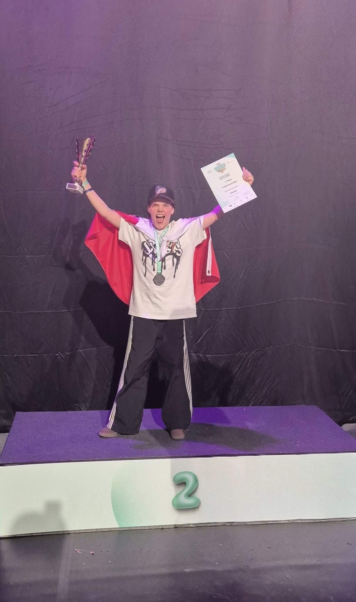 Wielki sukces naszego ucznia Tymona Glapińskiego w Mistrzostwach Świata w Lublanie w Słowenii. Tymon zdobył: wicemistrzostwo Świata w Hip Hopie w kategorii Junior 1, wicemistrzostwo Świata w duecie Poppingowym, 3 miejsce w Hip Hopie w bitwach tanecznych. Są to jak do tej pory najwyższe noty Tymona na Mistrzostwach tej rangi. Brawo Tymon! Jesteśmy bardzo dumni, że nasz uczeń tak wspaniale reprezentuje naszą Ojczyznę na świecie.