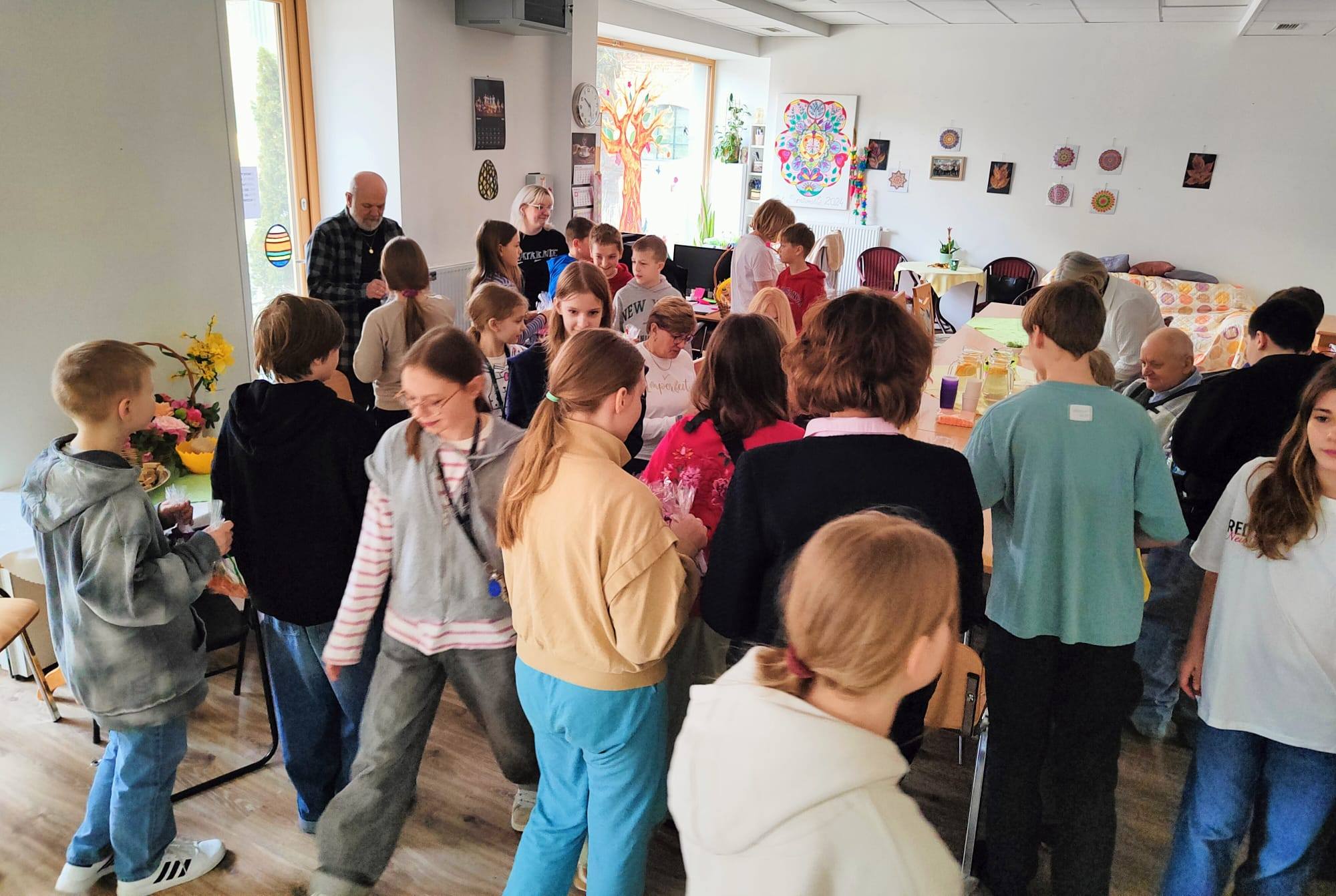 W ostatnim tygodniu przed Świętami Wielkanocnymi, uczniowie klasy 5c z Panią Wicedyrektor i wychowawcą odwiedzili Dom Dziennego Pobytu Seniora+. Dobre relacje budowaliśmy poprzez wspólnie spędzony czas, gry i zabawy integracyjne. Podarowaliśmy Seniorom serdeczne życzenia świąteczne oraz upominki wykonane przez uczniów i nauczycieli Szkoły. W zamian, zabraliśmy: radość, słodki poczęstunek i poczucie wartościowo spędzonego czasu.